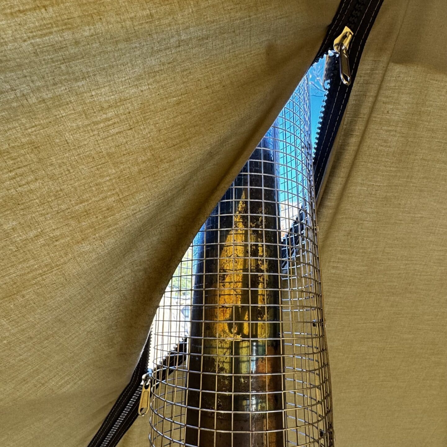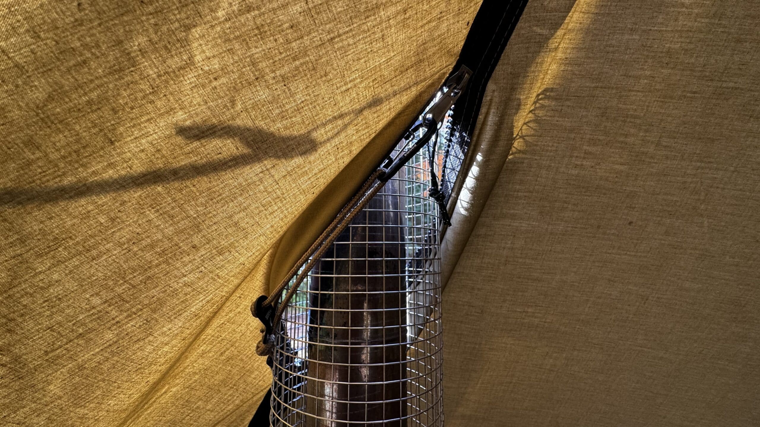 冬には以前から、GIGI-1の初期モデルに薪ストーブを入れてきましたが、ウォールパネルのファスナー開けたママにしてクリップで止める必要がありました。今回発売のTCモデルではその必要がなくなりました。
