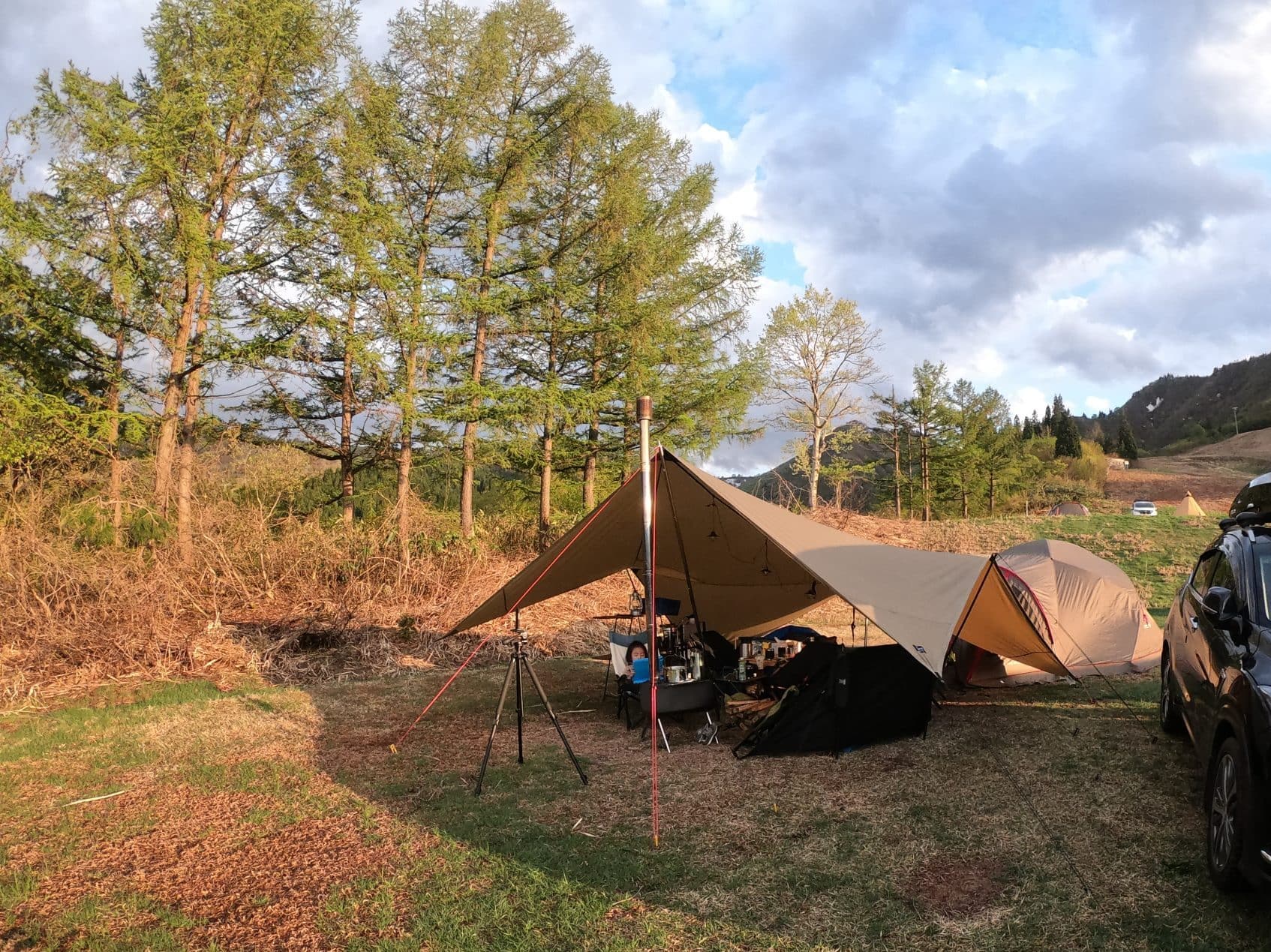 以前家族全員で来たことがあったんですが、今回は長女と次男の3人で。 この日は、タープのガイラインを纏めてた袋を忘れ、あり合わせのロープでなんとか設営しました。