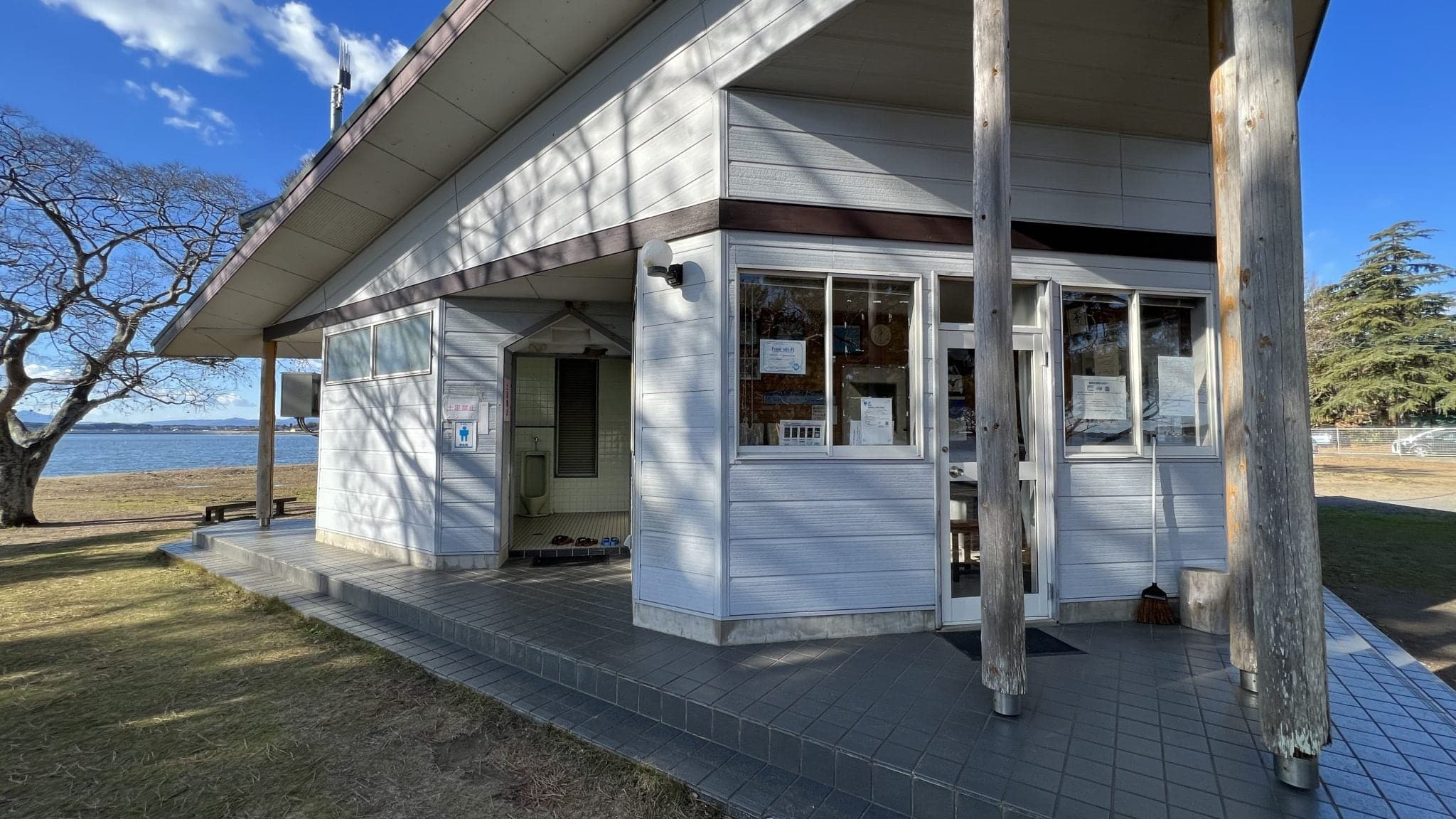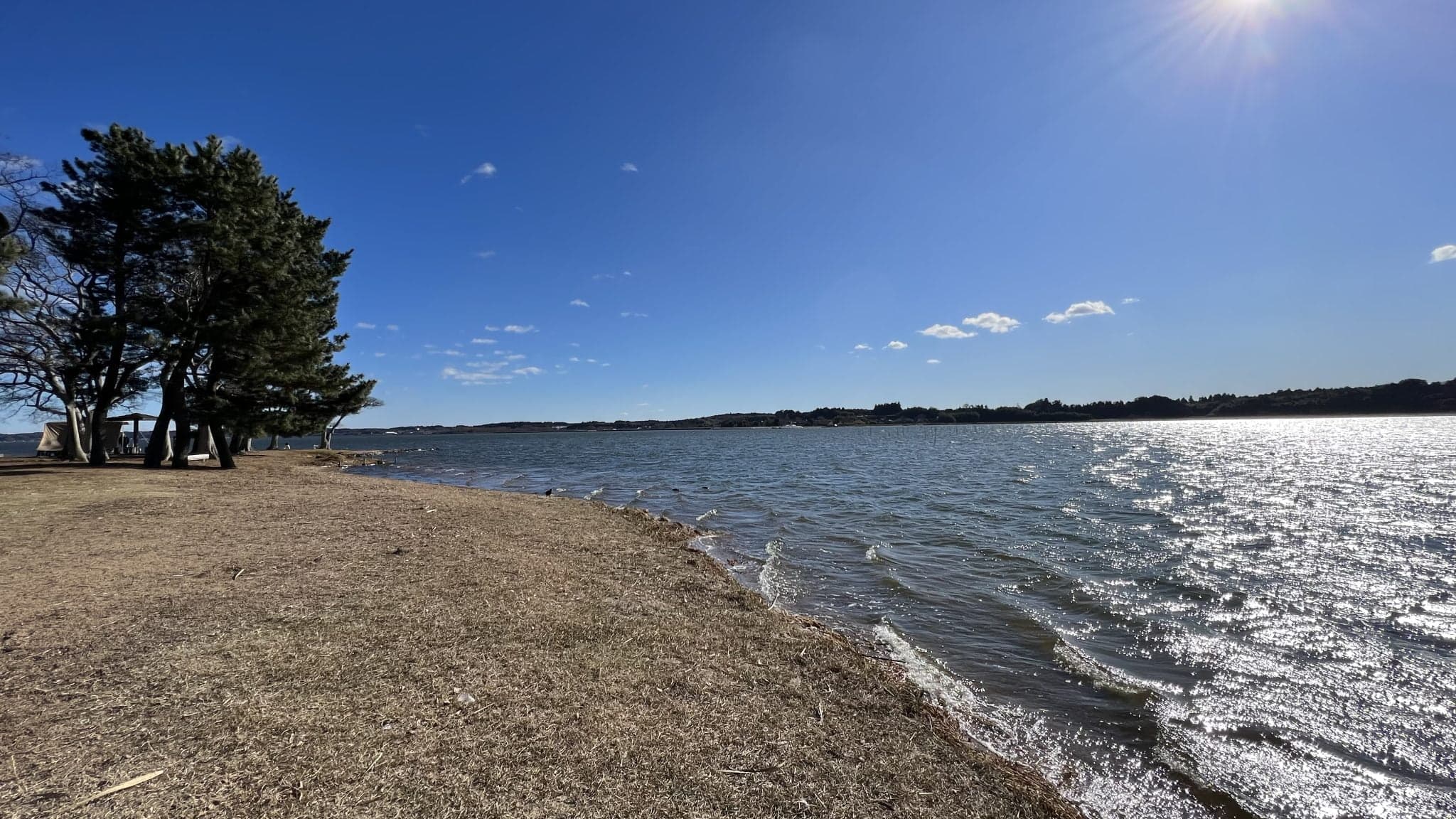 岬状に涸沼に突き出しているので、全面で湖面に向かって設営できるようです。 ただし、冬の昼間は西側からの風が強いようで、西岸は避けた方が良さそうでした。