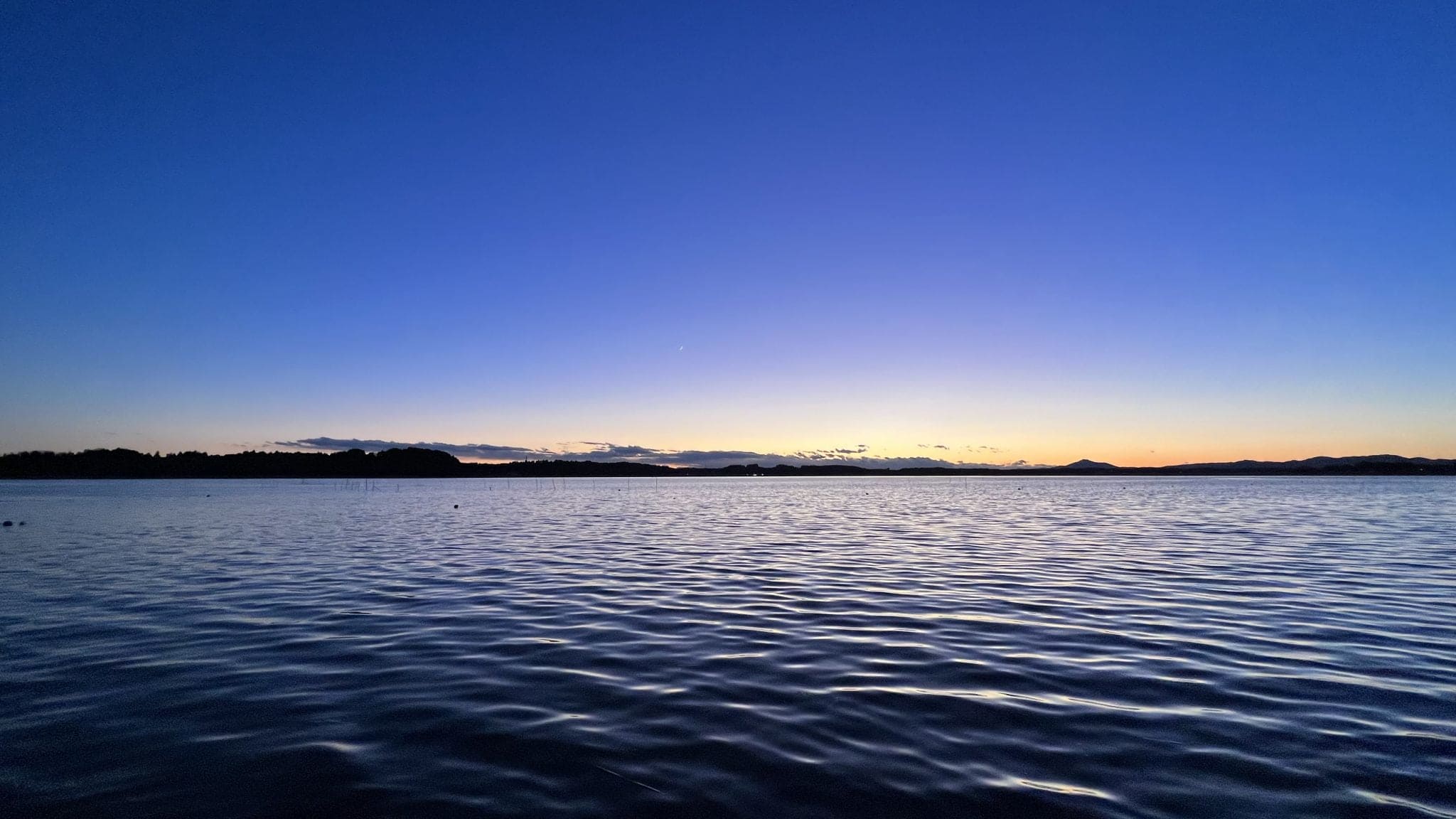 涸沼の水辺と朝焼けが近い、湖畔の静かなキャンプ場