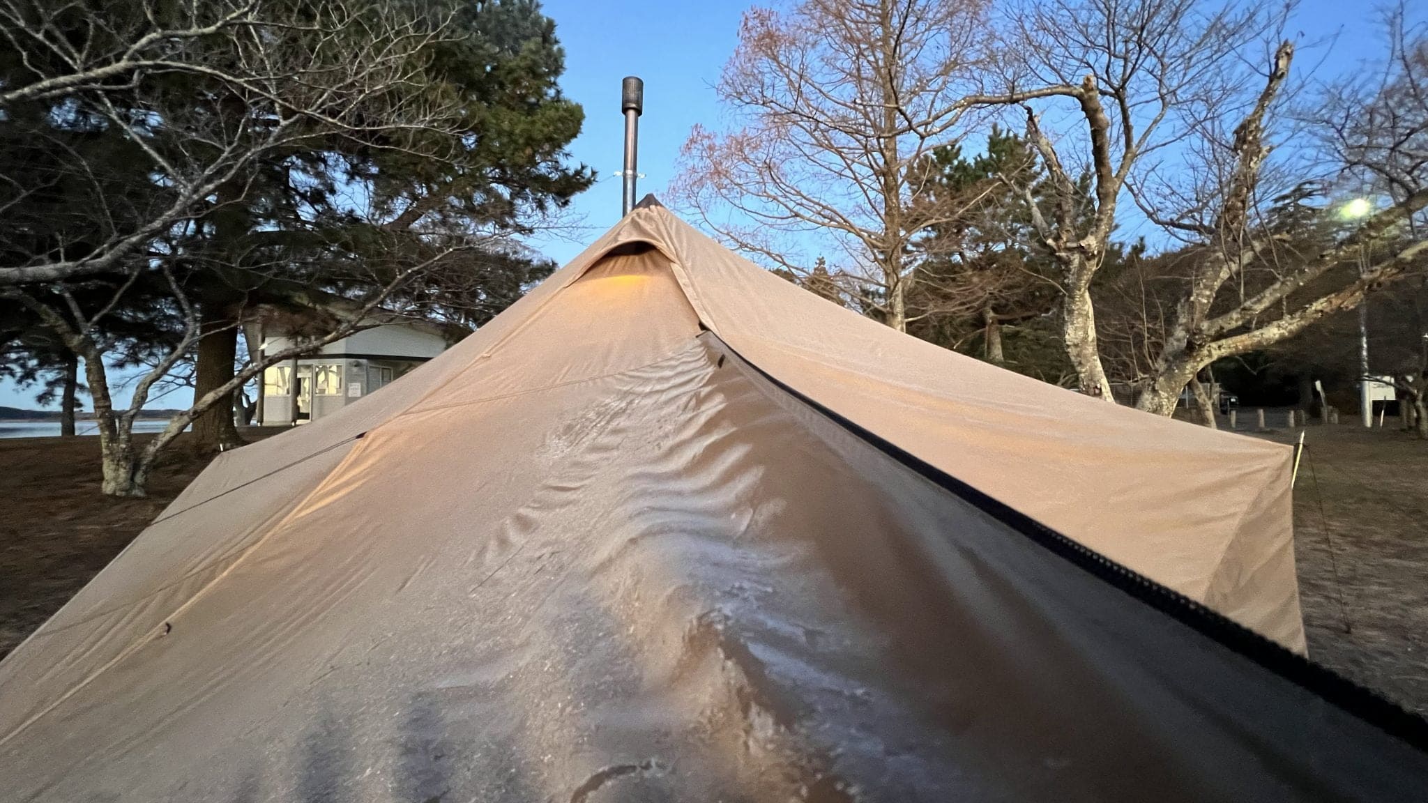 今回はGIGI-1に薪ストーブを入れる予定なので、風の影響が少ない東岸に設営。東岸では、翌朝眼前に素晴らしい朝焼けを見られました。