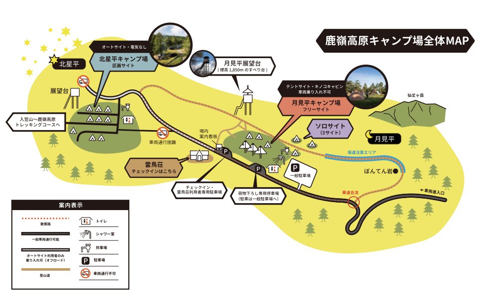以下マップのとおり、北星平キャンプ場、月見平キャンプ場と2箇所に分かれています。特に雷鳥荘より北側(マップ左側)はシカ柵に覆われています。