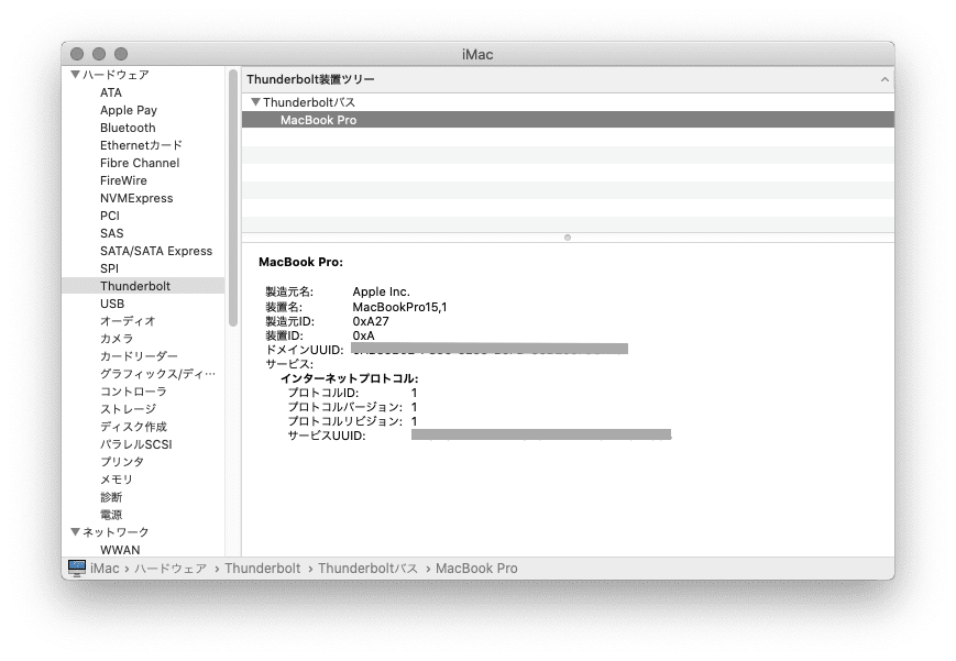 接続状態を確かめるために、iMacに一度ログインして、「Appleメニュー」から「このMacについて」を選択し、「システムレポート」を表示します。システムレーポートで「Thunderbolt」を選択し、右側のパネルに接続しているMacBookが表示されるか確認します。 接続しているMacBookの名称が表示されなければ、正しく接続できていないので、ケーブルの再接続やiMac、MacBook双方の再起動などを行うと接続できるようになります。