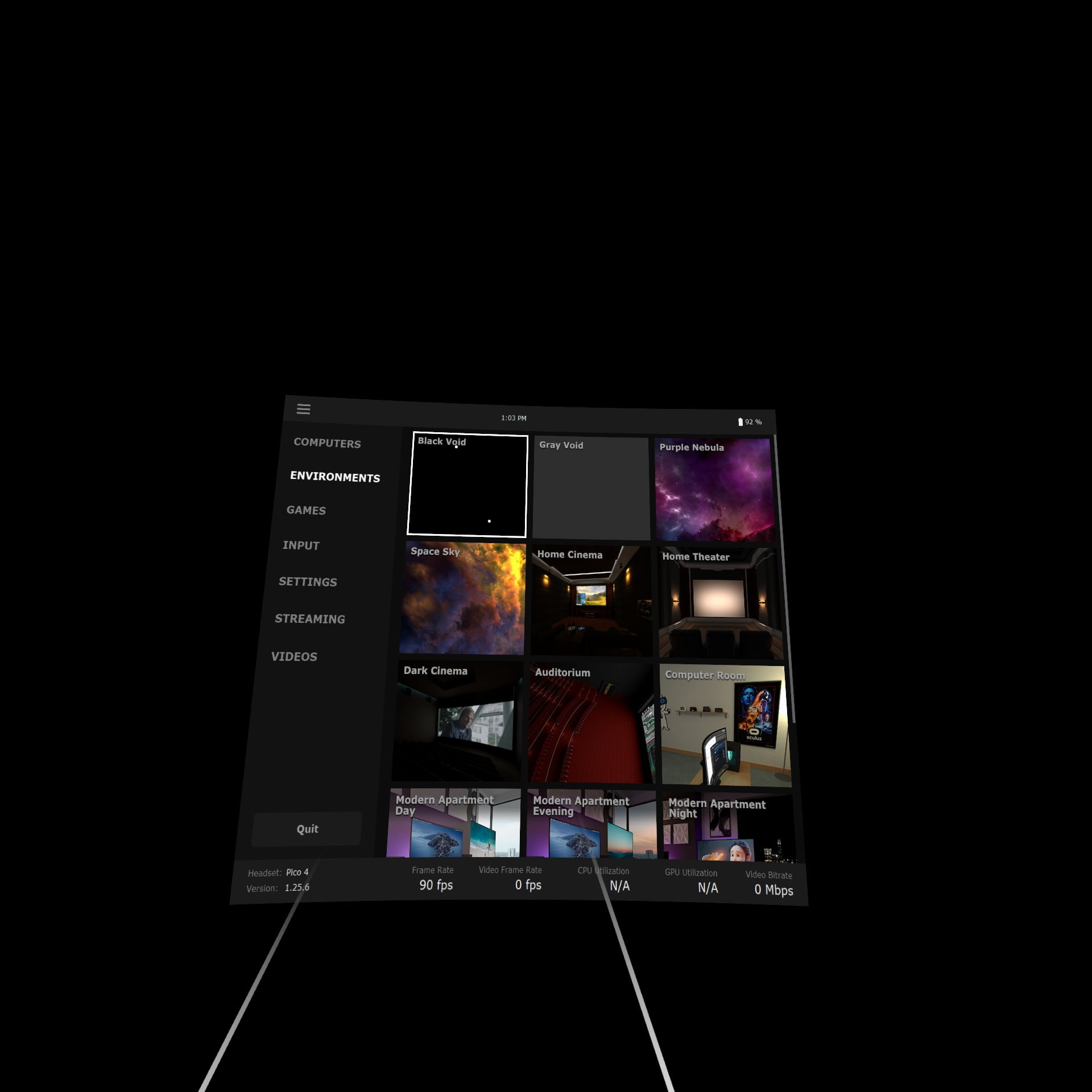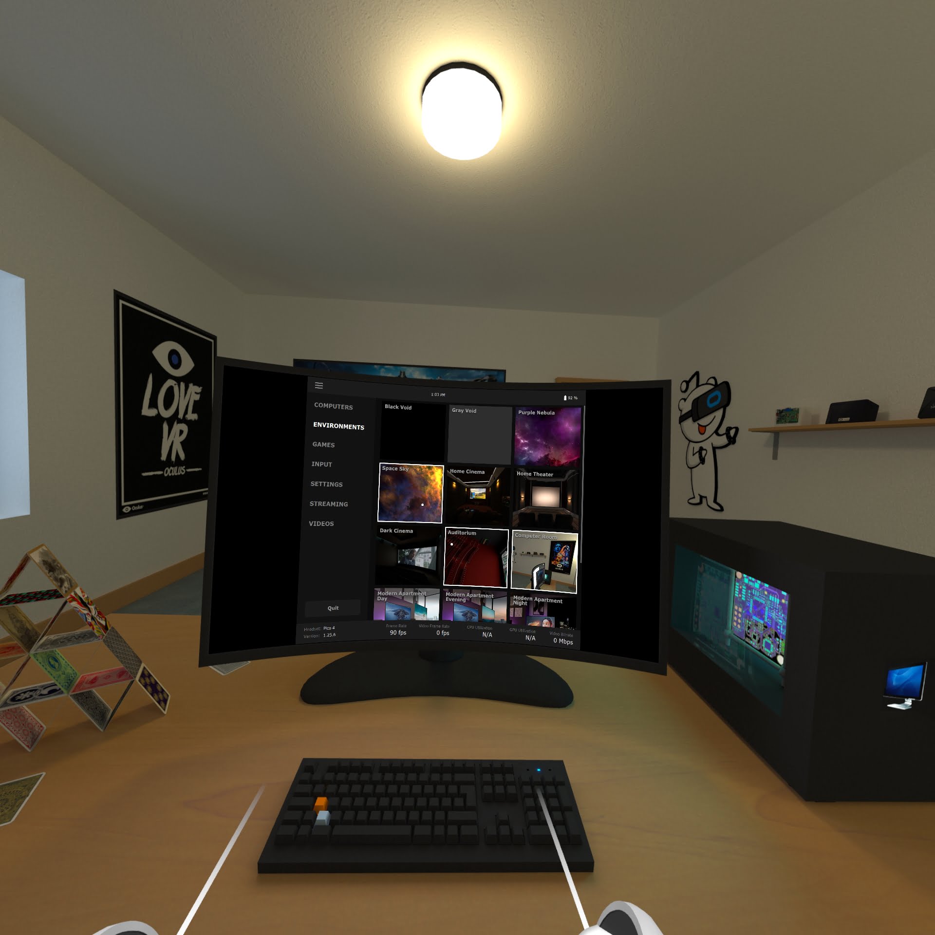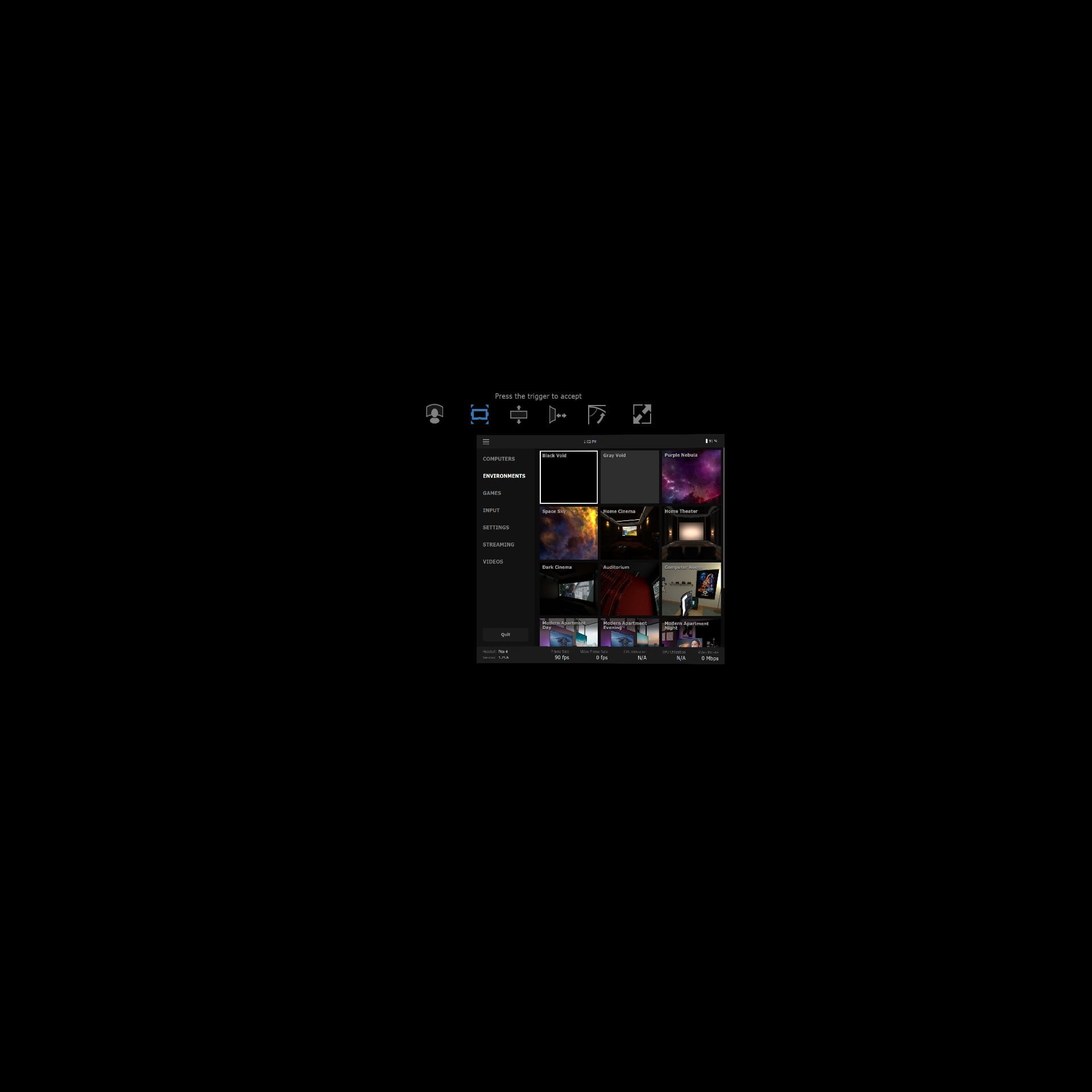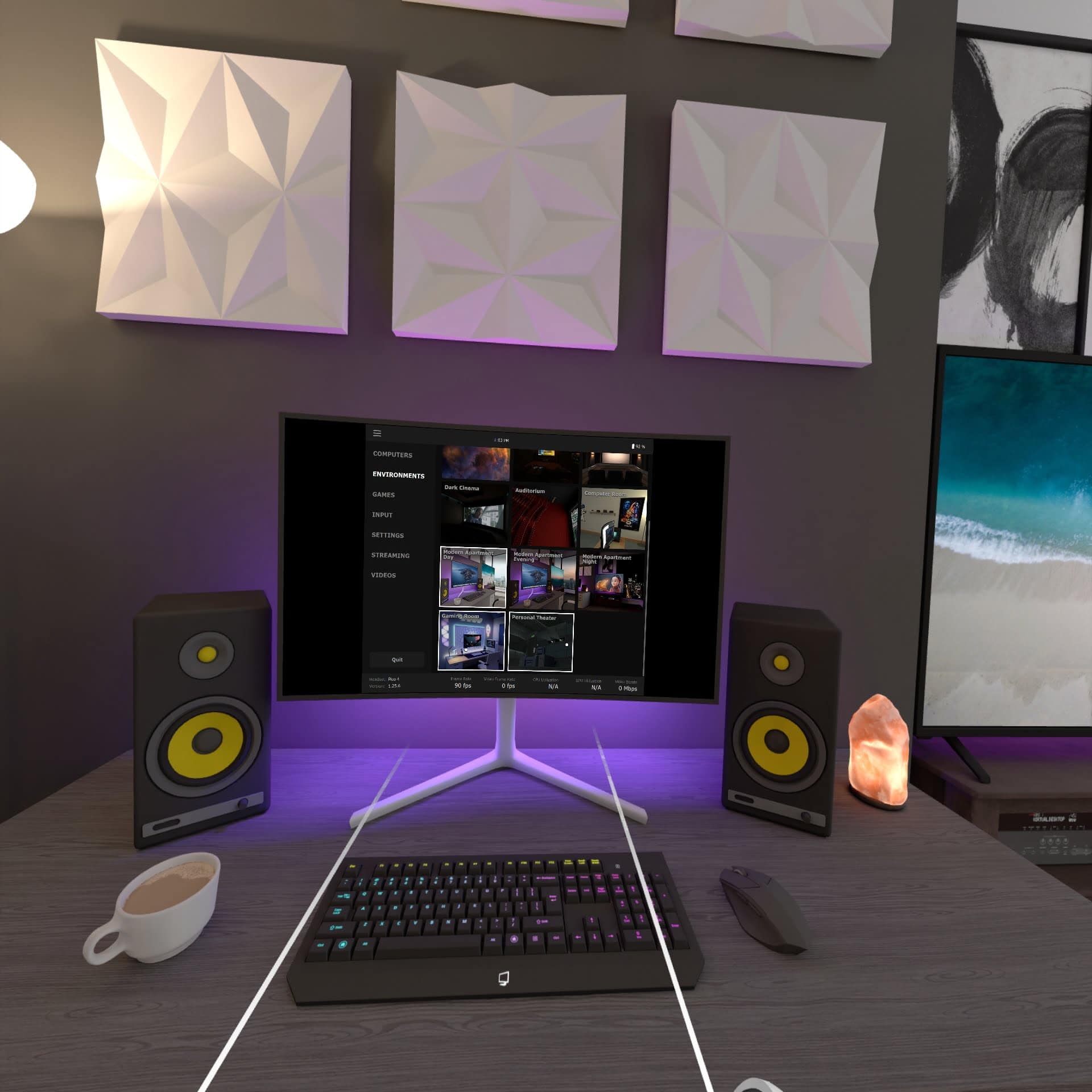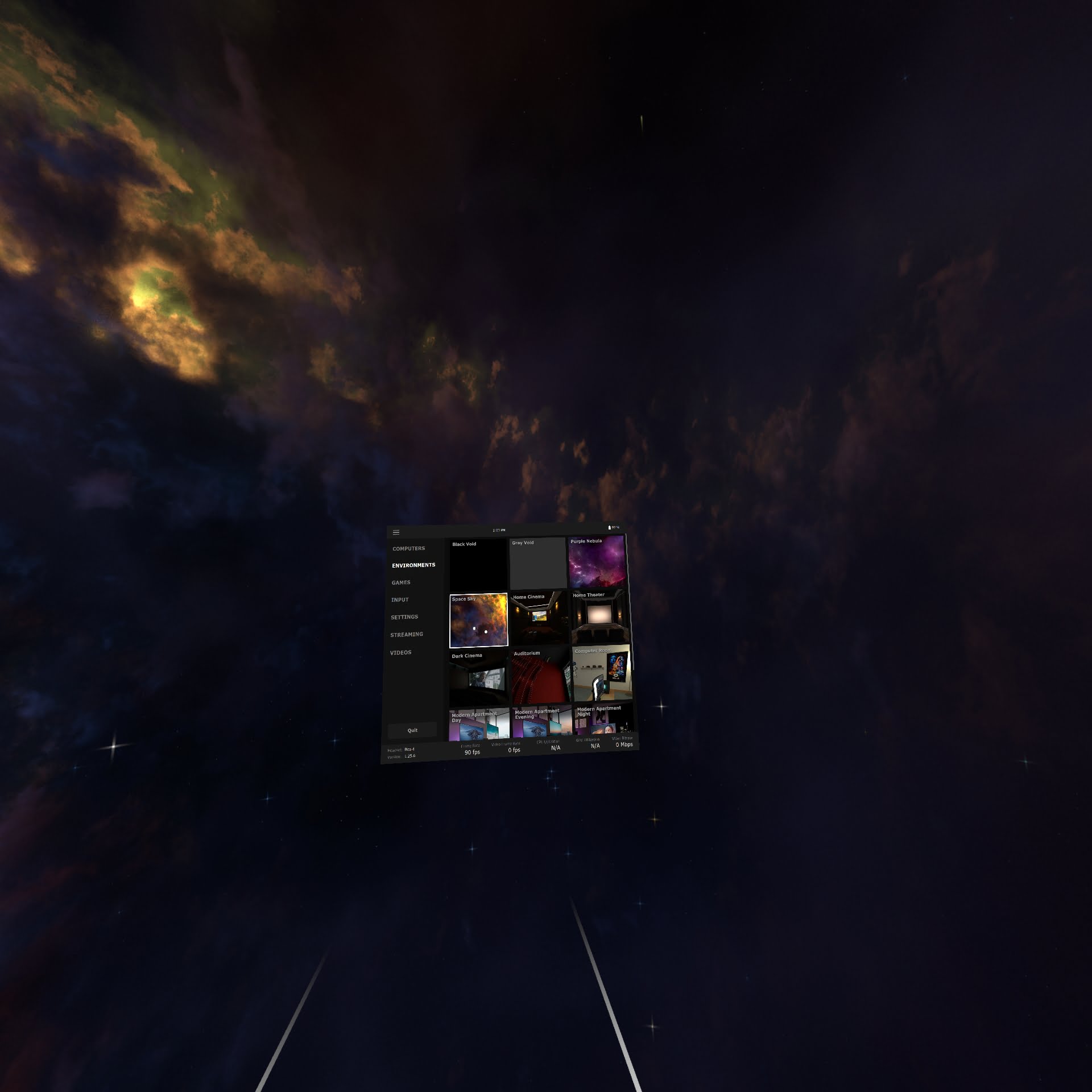 視聴環境はイロイロ選べますが、VR空間的な演出はVirtual Desktopには不要だと思います。 それっぽい感じには見えるけど、現実的には使えないし、粗が目立ちます。