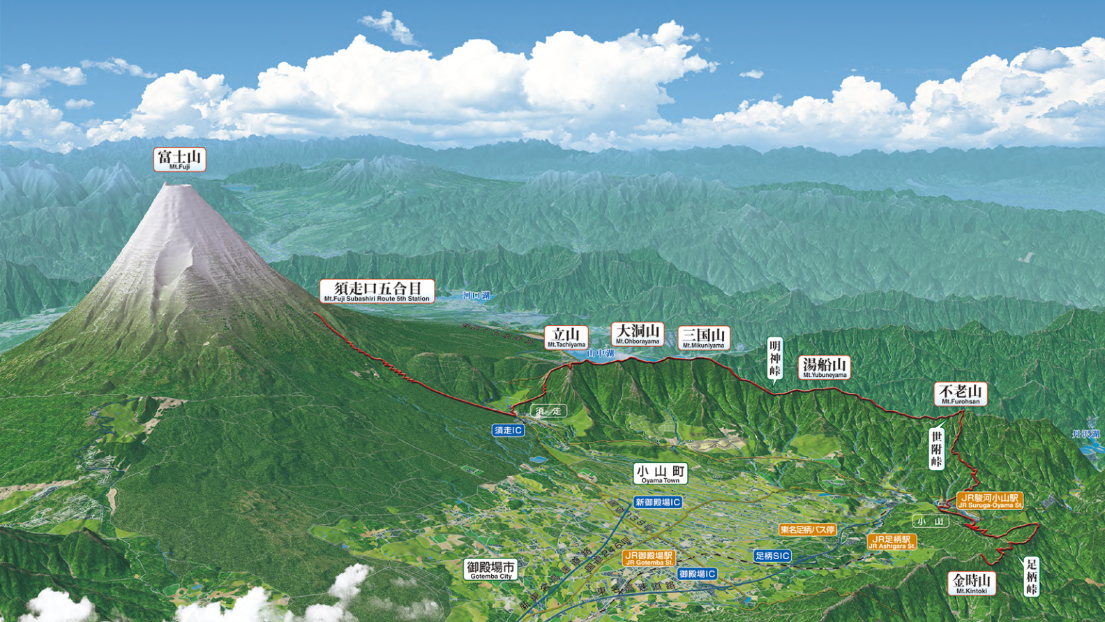 富士箱根トレイルは、静岡県と山梨県、神奈川県の県境に位置し、富士山五合目から西丹沢と呼ばれる三国山稜・湯船山・不老山を経て、足柄山系の金時山までを縦走する総延長約43kmの区間です。