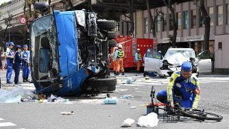 19日午後0時25分ごろ、東京都豊島区東池袋4の都道で、板橋区の無職、飯塚幸三さん(87)の乗用車が約150メートルにわたって暴走し、歩行者らを次々とはねた。警視庁によると、自転車に乗っていた近くに住む無職、松永真菜さん(31)と長女莉子ちゃん(3)が死亡し、飯塚さんを含む40~90代の男女8人が