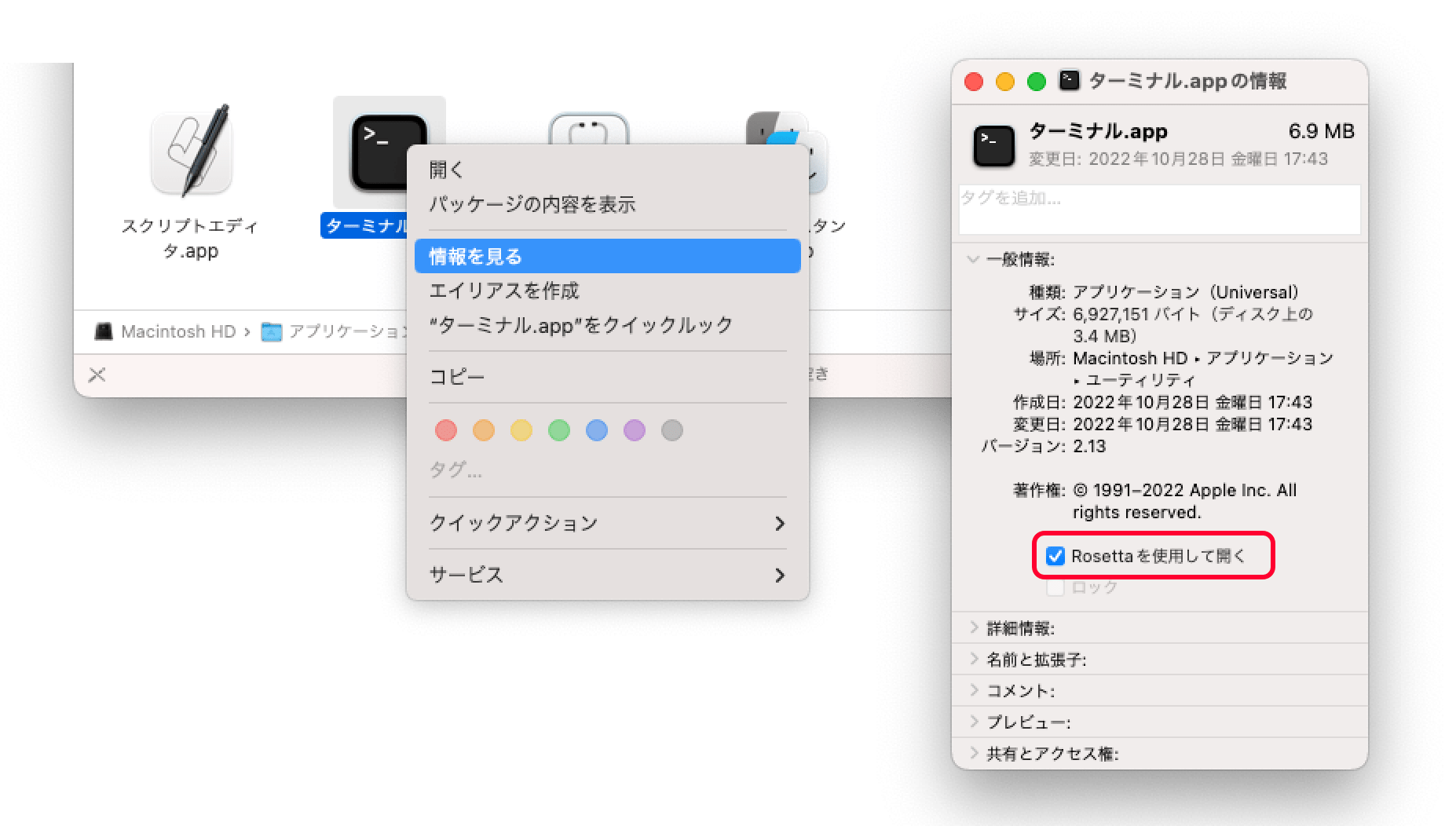 ターミナルの情報から、「Rosettaで開く」にチェック。
